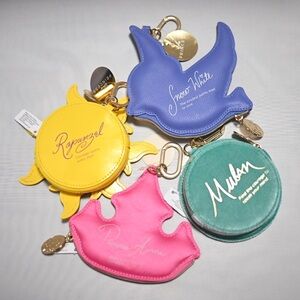 The brand new- with tags: Bath & Body Works Disney Coin Purse Keychain set features four iconic (highly sought after & sold out!) Disney Princess characters - Rapunzel, Princess Aurora, Snow White, and Mulan. Each coin purse is small in size and comes in vibrant colors such as yellow, pink, blue, and teal while each in a unique fabric/texture.