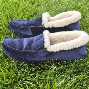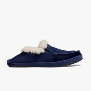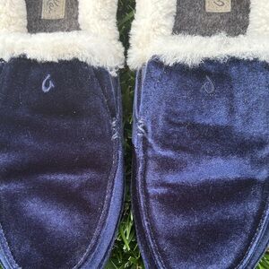 Soft OluKai slippers with plush cream lining. Cozy gray interior for ultimate comfort.
