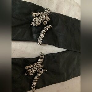 These are Zara leather gloves featuring a rhinestone-embellished salamander or lizard design