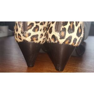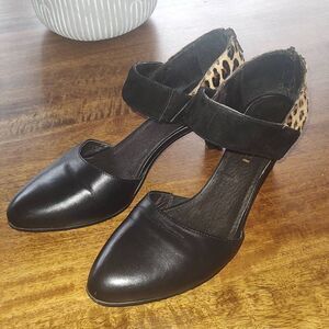 Chic black leather heels with leopard print accents. Stylish and comfortable design.