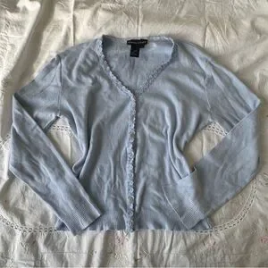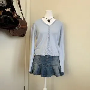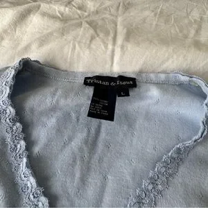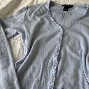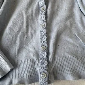 ⊹ light blue cotton pointelle knit with lace trim along neckline and buttons