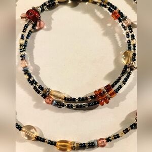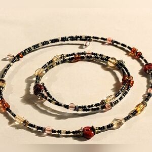 Handmade multicolor beaded necklace featuring black, gold, and pink beads with matching bracelet. Fully adjustable.