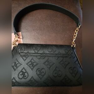 Stylish black shoulder bag with embossed design. Features gold-tone chain accents. Iconic Juicy logo on the front.