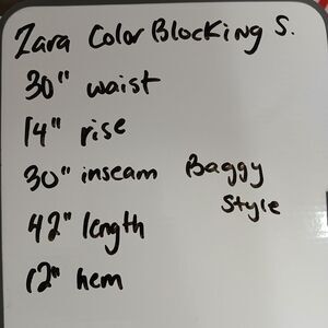 The Zara Two Tone Wide Leg Pants in women's size medium feature a stylish cargo design made from 100% cotton, perfect for the spring season. These pants have a high rise waist and a flat front, with a multicolor design that adds a fun and retro touch to your outfit. The wide-leg silhouette and 30-inch inseam offer a comfortable and hipster-inspired look, ideal for casual occasions and pairing with your favorite top for a trendy ensemble. Easy to care for with machine washable instructions, these pants are a versatile addition to any wardrobe.