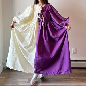 Handmade Puff Sleeve Half & Half Cottage Dress | 100% Cotton | SKU 10024 Purple And White This handmade cottage dress features soft puff sleeves, an adjustable tie-front, and a distinctive half-and-half color design. Made from pre-washed 100% cotton lightweight fabric. Unlined. Reversible design — can be worn with either side facing forward. Handmade in Calgary, Canada. Size: OS. Intended for size L, but could it others as well depending on measurements. Approximate measurements laying flat: Bust: 23”(adjustable with ties). Waist: 22”(adjustable with ties). Pit to hem: 45”. Length: 55”. Shown on model 5’5” tall. In excellent condition — please refer to photos for full details.