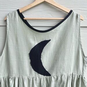 100% Linen | Handmade Quilted Linen Sleeveless Dress SKU 08014 Black Moon/The Moon’s Phases Crafted with care in Houston, TX, this one-of-a-kind quilted dress is made entirely from 100% high-quality linen. The skirt part beautifully showcases the phases of the moon. Material: 100% premium linen (new and repurposed). Construction: Fully serger-finished for durability. Design: Reversible — can be worn on either side. Condition: Brand new. Size: One Size (OS) Intended for size L, but may fit a range of sizes depending on individual measurements. Please refer to the flat lay measurements below for best fit. Approximate Flat Lay Measurements: Bust: 22”. Waist: 21”. Pit to Hem: 48”. Total Length: 58”. Care Instructions: Machine wash gently or hand wash. Use a dryer on low heat or hang to dry. Iron on low heat if needed. Handmade with love and attention to detail. Please see photos for a closer look at the design and craftsmanship.