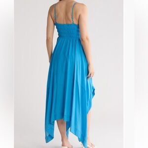 Light, flowy, and made to move. This vibrant blue maxi features delicate straps, a smocked waist for a flattering fit, and a breezy handkerchief hem that floats beautifully with every step.