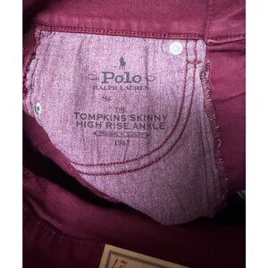 A women high rise Thompkins ankle skinny maroon pants from Polo Ralph Lauren. The pants are in a stretch denim with a logo pony on back pocket. The jeans pants are new with tags.