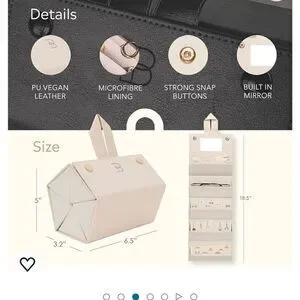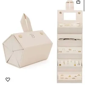 Brand new roll up jewelry organizer for traveling. Specific compartments keep things from tangling or getting lost. Rolls into a hexagon shaped bundle that stashes in luggage easily. Snap closure. Loop for hanging and small mirror.