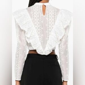 Romantic and statement-making, this Sandro Shena blouse features intricate floral embroidery with dramatic V-shaped ruffle detailing at the front and back. The semi-sheer finish and cropped silhouette give it a modern, elevated feel.