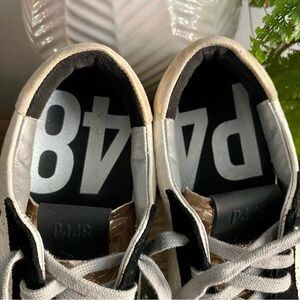 Excellent preowned condition. Low top. Distressed style sneaker. Sparkle detail. Suede toe. Leather upper.