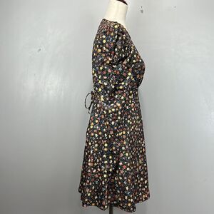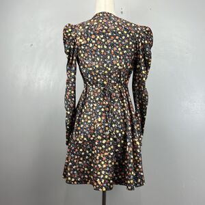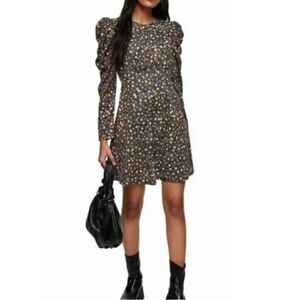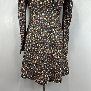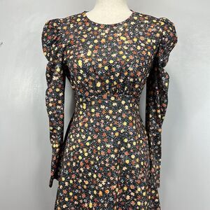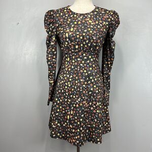 Chic floral dress with puff sleeves, perfect for any occasion. Features a stylish black base with colorful floral patterns.