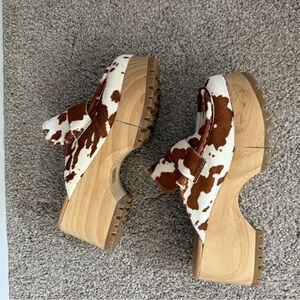 Stylish cow print mules. Comfortable wooden sole. Perfect for casual wear.