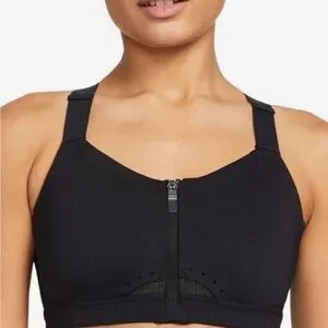 Experience comfort and support with this sleek black Nike Dri-Fit sports bra. Designed for active women, it features a convenient front zipper for easy wear and a hook & Loop closure in the back.