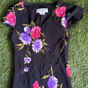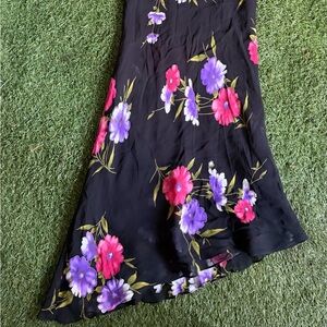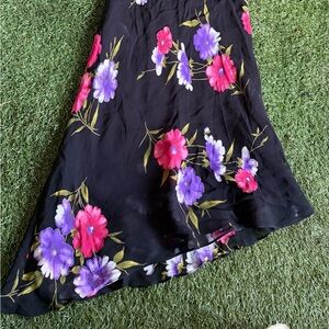 Perfect summer night black dress with pink and purple flowers. Fully lined with a poly stretchy fabric. Longer on one side. Fabric does has a bit of stretch. Size tagged 8 petite so best fits for a medium if you want a more fitted look. Seen on a small 5’7” Measurements coming soon.