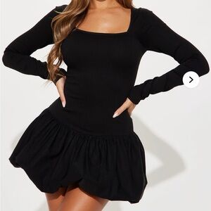 Elegant black mini dress with long sleeves and a square neckline. Fitted top with a flared skirt for a flattering look.