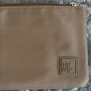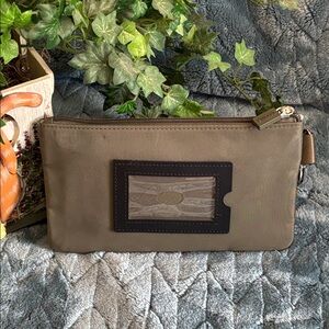 Features: Main zip closure, clear-view ID window, removable wristlet strap. Lined interior, zip pocket, built-in RFID wallet with card slots. Gently used, in excellent condition.