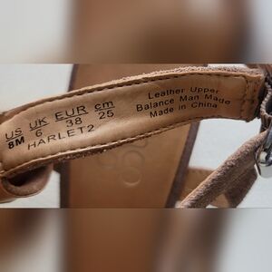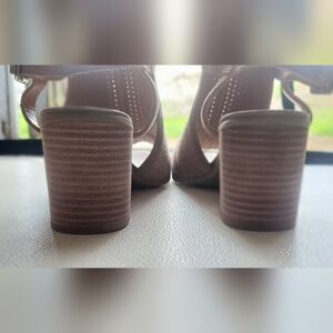 The color is more of a fawn color. Very clean. There are shadows in the pic with the front where the toes should be. Be assured they are very clean. Only wore a few times. With their perforated suede and leather stacked heels, these sandals are perfect for any occasion. These shoes offer both comfort and sophistication.