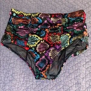 With a flattering ruched high waist and shimmery snake skin print, this swim bottom is a sexy, full-coverage style for the beach.