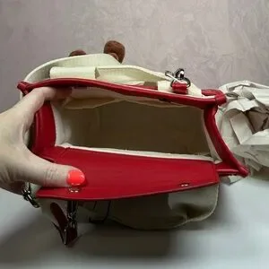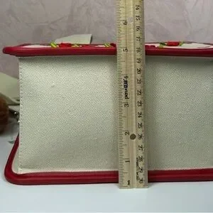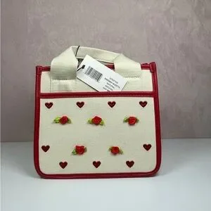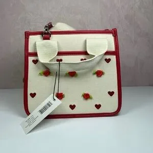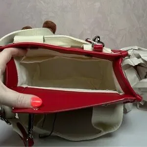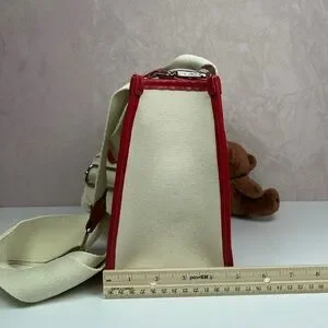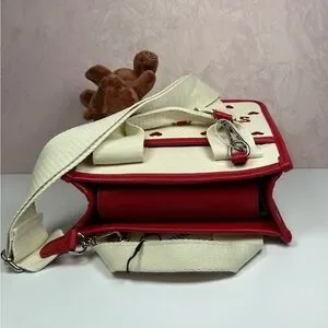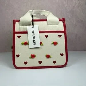 Charming natural and red tote bag featuring 'Steve Madden' text and floral accents. Comes with an adorable teddy bear charm.