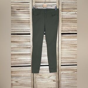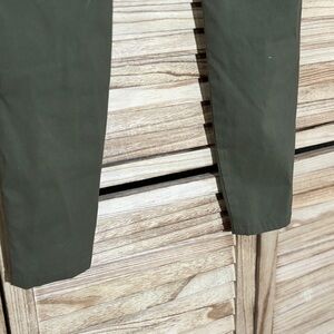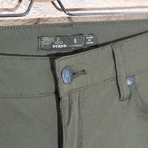 Comfortable stretchy trousers by Prana. Perfect for business casual to yoga to hiking. Olive green gently pre-owned condition pants with small scuff at bottom of hem.