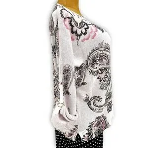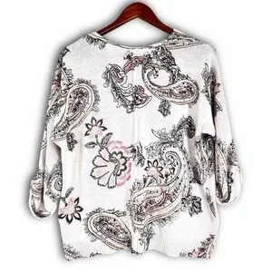 Chico's Blush Pink Paisley Sweater Sz 3 (XL) 3/4 Roll Tab Sleeve Romantic Cotton