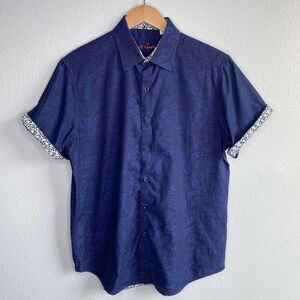Robert Grahman Mens Large Navy Paisley Button Up Shirt Flip Cuff Short Sleeve