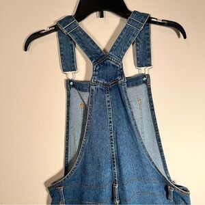 Style: Distressed denim short overalls