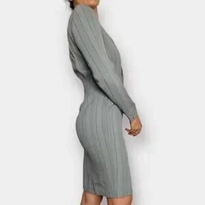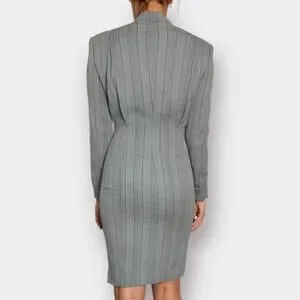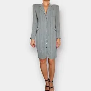 90s button front gray striped jacket dress. Fitted through waist and hips. Notched lapel.
