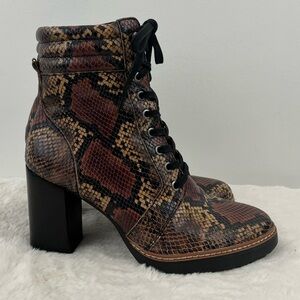 NATURALIZER Callie 2 Snakeskin Lace-Up Ankle heeled Boots. These boots can be adjusted in 2 ways. lace up and side zipper. Lugged sole. Stacked heel . 3/4" sole. Genuine leather upper. . Padded insole. Naturalizer is widely knows for having comfortable shoes. Retailed for $220