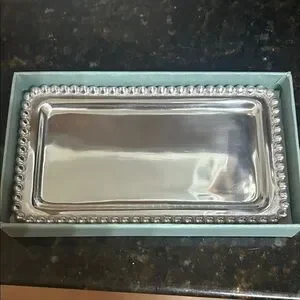Chic silver tray with beaded edges. Ideal for decor or serving.Brand new from Bloomingdales nice