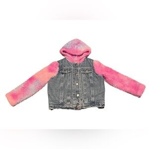 Baby Sara Pink/Blue Fuzzy Heart Snap Up Hybrid Hooded Jean Jacket Size 4