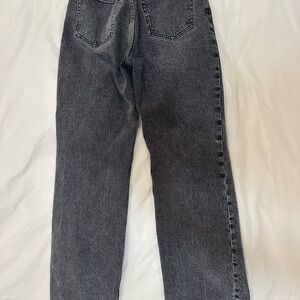 90s high rise relaxed fit in a dark gray wash. Features a high rise that is fitted at the waist through the seat to show off your best butt. Eases open through the thigh into a full-length, relaxed leg shape. Made from Vintage Comfort Stretch fabric with structure and slight stretch. 25s