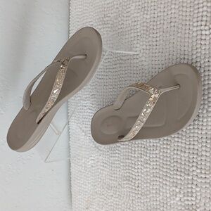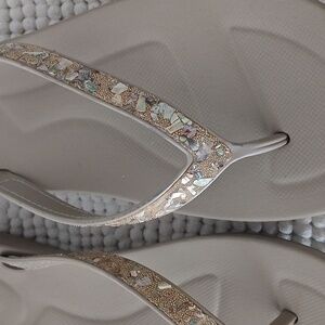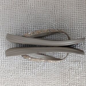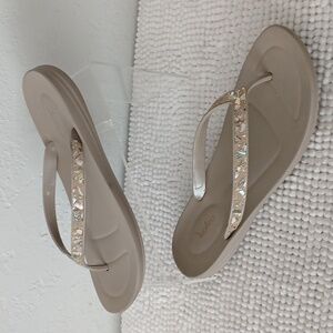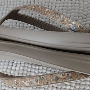 Stylish taupe sandals with sparkling beaded straps. Ideal for everyday wear.
