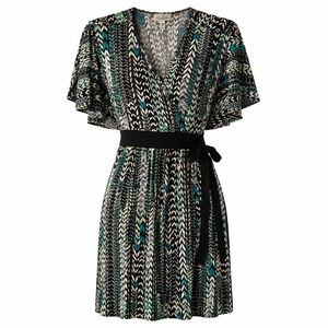 Beautiful black, ivory, and teal abstract chevron print with a flattering faux wrap neckline and flutter sleeves. Features a stretchy black waistband with side tie for a defined silhouette. Lightweight, comfortable, and easy to dress up or wear casually.