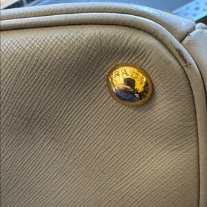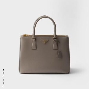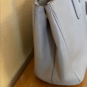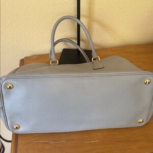 Elegant Prada tote bag. Smooth gray leather. Gold-tone logo detail. Dual handles. Zipper closure. Pre-owned, no visible flaws just small one on the bottom. . Verified authenticity. Cross body strap included.