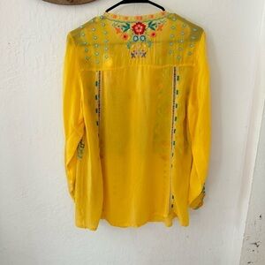 Johnny Was Arges Embroidered Yellow Button Front Asymmetrical Sleeve Tie Tunic S
