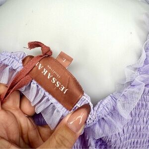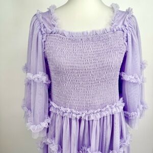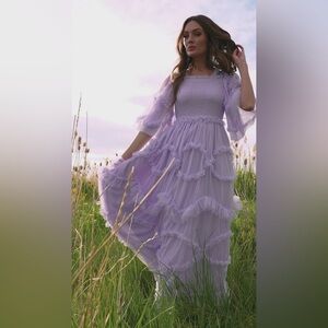 This is a stunning, NWT (New With Tags) JessaKae Ever After Ruffle Maxi Dress in the desirable Lilac Tulle colorway, perfect for making a sophisticated and romantic entrance at any special event. This full-length, tiered dress features a fully smocked bodice and ethereal 3/4 sheer ruffled sleeves, embracing the popular cottagecore and princesscore aesthetic.