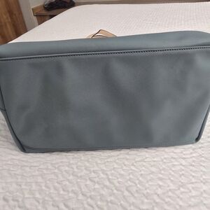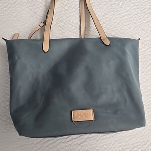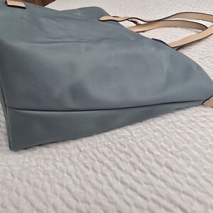 Stylish Radley London dusty blue tote with tan leather handles. Perfect for daily use. Spacious and chic. This would make an excellent work bag! Definitely room for laptop and all of your essentials.