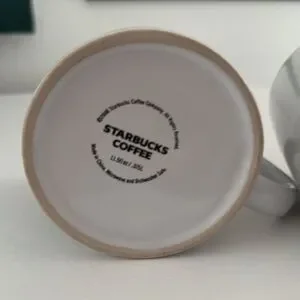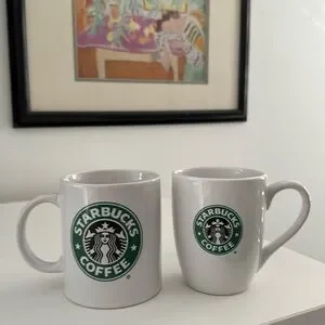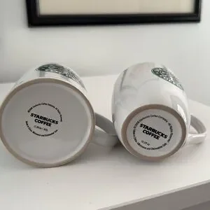 Two iconic Starbucks mugs from 2008, they are in good condition with chips or cracks, but both mugs have faint utensil marks inside and on the bottom especially. Please see pictures before ordering.