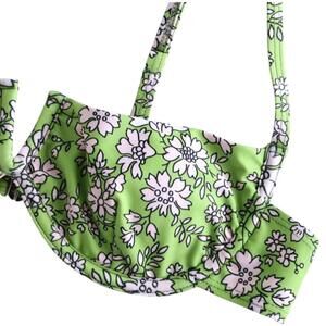 ZAFUL 2pc Green Swimsuit Tiny White Floral V-Wired High Leg Bikini Swimwear Sz S
