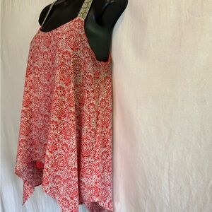 Cato Pink, White & Tan, Scoop neck, Sleeveless, Pullover, Summer Blouse. Longer on the sides than middle. Thin & lightweight. Dressy feel. Slightly stretchy. Polyester & spandex blend shell with 100% polyester liner. Gently used with no stains or flaws.