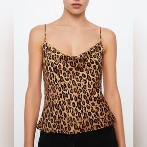 ZARA leopard print camisole featuring gold chain strap detail. Lightweight tank with ruched front and double-layered chest panel. Style #9219/561/051.