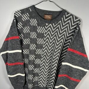 The Vintage Grandpa Sweater is a men's large multicolor geometric acrylic knit sweater with a 90s theme. This tight-knit sweater features a crew neck, long sleeves, and is machine washable. Made of nylon and acrylic, it is perfect for casual travel, parties, or cocktails during the winter and fall seasons. The vintage design adds a unique touch to this pullover sweater, making it a stylish and comfortable choice for men looking to add a retro flair to their wardrobe.