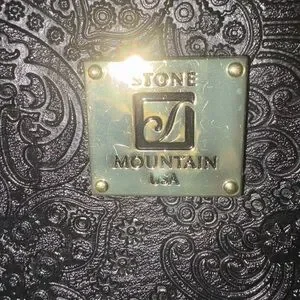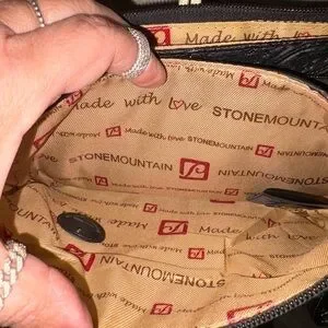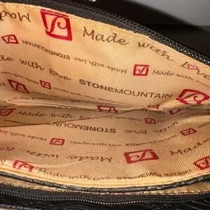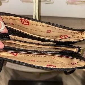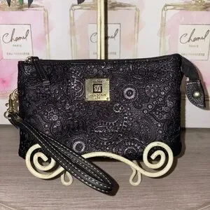 Elegant black leather wristlet with embossed paisley pattern. Features a secure zip closure and detachable wrist strap.