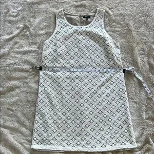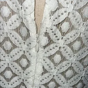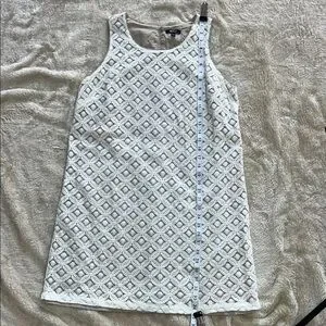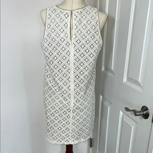 Stylish white sleeveless dress with intricate lace design. Ideal for any event.