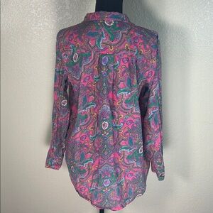 Beautiful Sundance paisley shirt in a size medium. This eye-catching piece features a vibrant mix of purples and pinks in an intricate paisley pattern, giving it a romantic, bohemian feel. The colors blend beautifully, making it a standout addition to any wardrobe.