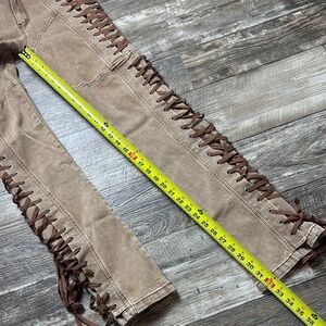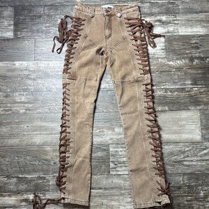 Stylish tan pants with lace-up sides. Flared leg design. Perfect for a chic look.