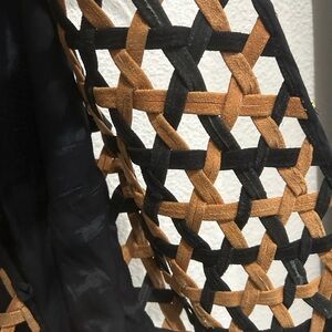 Stylish vest with a geometric pattern in black and tan. Perfect for adding a unique touch to any outfit.
