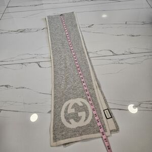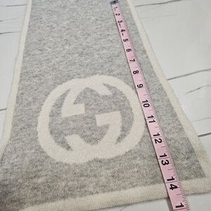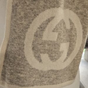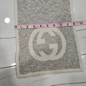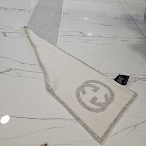 Luxurious Gucci scarf with signature logo. Soft gray and cream tones. Elevate your style effortlessly. Approximate 74.5" long and 9" wide. In EUC